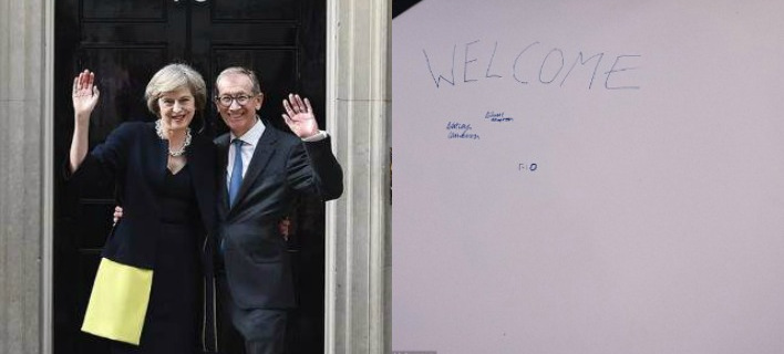 Ανάμεσα σε όλους που την υποδέχτηκαν, η Τερέζα Μέι είχε και ένα απροσδόκητο καλωσόρισμα. Ενα σημείωμα από τα παιδιά του Ντέιβιντ Κάμερον, Νάνσι, Ελγεν και Φλόρενς, τα οποία της έγραψαν «Καλώς ήρθατε», σημειώνοντας τα ονόματά τους.