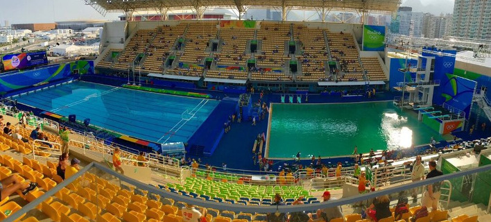 Αθλητές και κοινό αναρωτιόντουσαν τι στο καλό γίνεται με την πισίνα καταδύσεων, η οποία από μπλε άρχισε να πρασινίζει, με τους υπευθύνους να εξηγούν πως φταίει η ζέστη και να διαβεβαιώνουν πως οι αθλητές δεν διατρέχουν κανένα κίνδυνο.