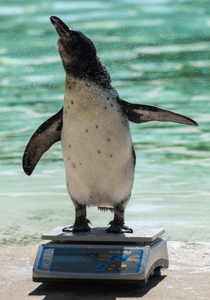 Një pinguin teksa kryen matjen e përvitshme në një kopsht zoologjik në Angli.