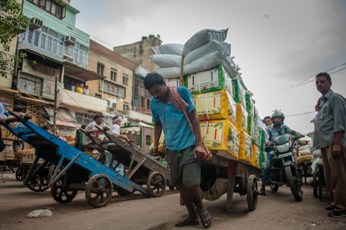 Indi, njerëz duke bartur ushqime nga fabrikat për t'i dërguar në dyqanet e tyre