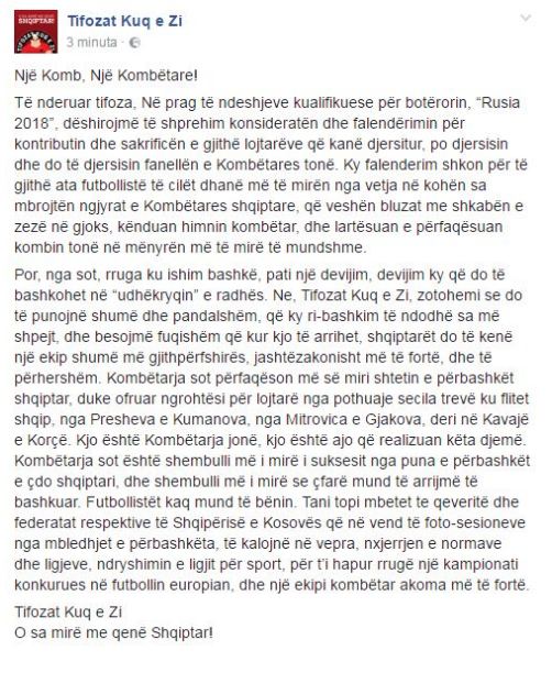 The post "Tifozat Kuq e Zi", thirrje qeverive për bashkimin e kombëtareve appeared first on INSAJDERI. |