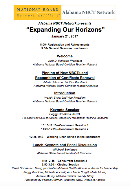 The Alabama NBCT Network's annual conference is being held January 21, 2017 at Homewood Middle School in Birmingham where we will be Expanding Our Horizons. The schedule is filled with a phenomenal blend of formal and informal learning opportunities suitable for everyone on the education profession continuum, from preservice teachers, early career teachers, veteran teachers, administrator, to education advocates. You do not need to be an NBCT to attend.