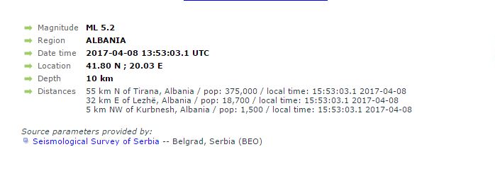 | Termeti në Shqipëri me lëkundje 5.2 shkallë të rihterit Posted: 08 Apr 2017 07:16 AM PDT Lëkundje të forta tërmeti janë ndjerë në qytetin e Tiranës dhe zonat përreth, ndërsa lëkundja ka pasur magnitudë 5.2 ballë i shkallës rihter. Lëkundjet janë regjistruar rreth orës 15:53 minuta me një thellësi 10 km. Epiqendra e tërmetit është 55 kilometra nga Tirana dhe 32 km nga Lezha, shkruaj mediat në Shqipëri. Deri tani nuk raportohet për persona të lënduar, apo për dëme materiale. The post Termeti në Shqipëri me lëkundje 5.2 shkallë të rihterit appeared first on INSAJDERI. |