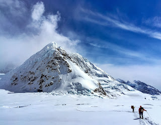 | 16,600' on the ridge with the fresh snow, above a feature named Washburn's Thumb. We are betting it looked similar to this photo for the team today after the recent snowfall. Photo Tom Torkelson. |