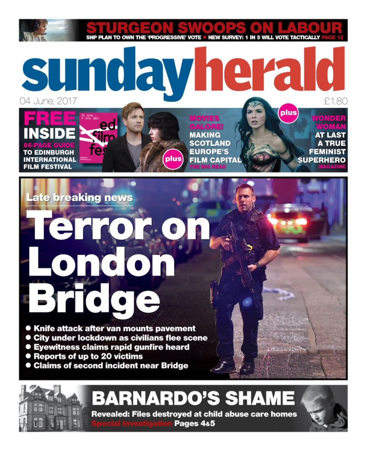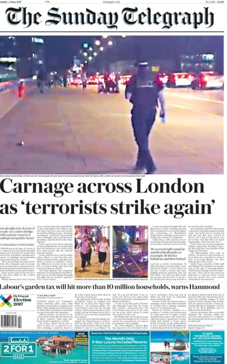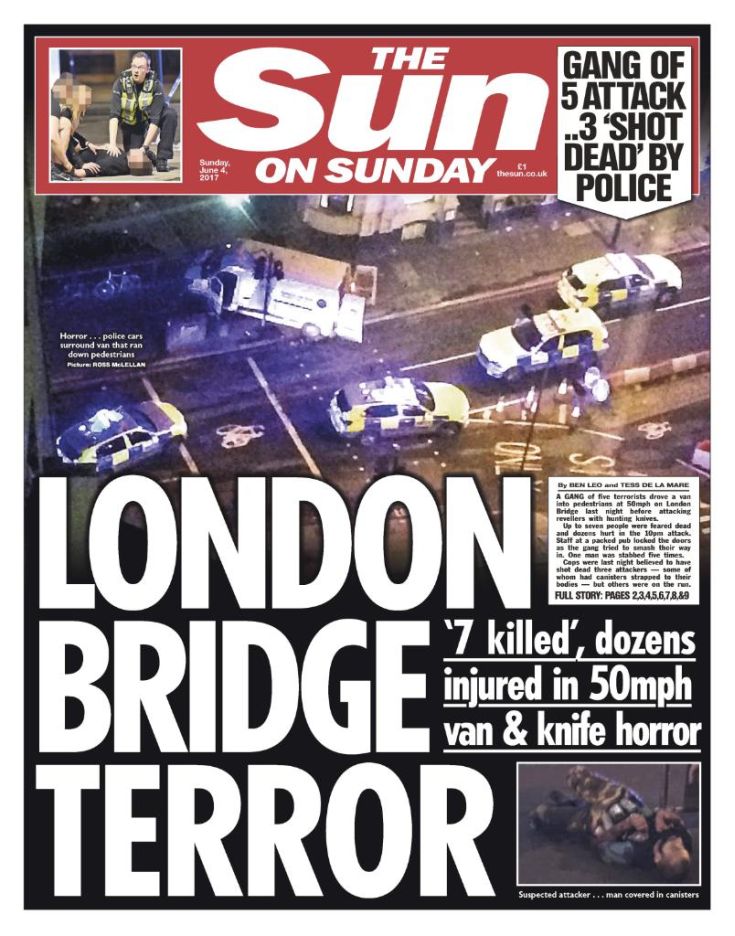 ... βρετανικού και διεθνούς Τύπου...Με τις λέξεις «τρόμος» και «σφαγή» να κυριαρχούν, κυκλοφορούν σήμερα οι βρετανικές εφημερίδες, ενώ ...και στον διεθνή Τύπο αναφέρεται σε δραματικούς τόνους το τριπλό χτύπημα στο Λονδίνο που άφησε πίσω τους έξι πολίτες νεκρούς.