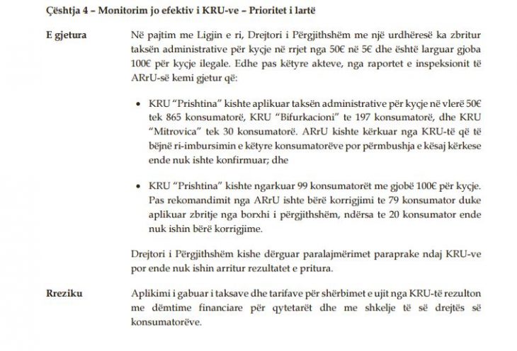 | KRU “Prishtina” mashtroi dhe dëmtoi financiarisht afër 1000 qytetarë Posted: 25 Jun 2017 08:42 AM PDT Kompania Rajonale e Ujësjellësit “Prishtina” i kishte sugjeruar konsumatorët që të paguanin 50 euro për kyçje në rrjet vitin e kaluar, edhe pse taksa administrative për kyçje ishte zvogëluar në vetëm 5 euro. Të gjeturat e Zyrës Kombëtare të Auditimit (ZKA), bëjnë me dije se 865 konsumatorë të KRU “Prishtina” janë kyçur në rrjetin e ujësjellësit në vitin 2016, duke paguar 45 euro më shumë sesa ishte e paraparë me ligj, raporton Insajderi. Në pajtim me Ligjin e ri, Drejtori i Përgjithshëm i Autoritetit Rregullativ të Ujit (ARrH) me një urdhëresë gjatë vitit të kaluar kishte zbritur taksën administrative për kyçje në rrjet nga 50€ në 5€ dhe kishte larguar gjobën prej 100 eruove për kyçje ilegale. Edhe pas këtyre akteve, nga raportet e inspeksionit të ARrU-së, Auditori Gjeneral ka dëshmi se si KRU “Prishtina” dëmtoi financiarisht qytetarët e rajonit të Prishtinës, raporton Insajderi. “KRU ‘Prishtina’ kishte aplikuar taksën administrative për kyçje në vlerë 50€ tek 865 konsumatorë, KRU ‘Bifurkacioni’ te 197 konsumatorë, dhe KRU ‘Mitrovica’ tek 30 konsumatorë. ARrU kishte kërkuar nga KRU-të që të bëjnë ri-imbursimin e këtyre konsumatorëve por përmbushja e kësaj kërkese ende nuk ishte konfirmuar”, thuhet në raportin e Auditorit të Përgjithshëm. Madje, KRU "Prishtina" kishte ngarkuar 99 konsumatorët me gjobë 100€ për kyçje. Por, pas rekomandimit nga ARrU ishte bërë korrigjimi te 79 konsumator duke aplikuar zbritje nga borxhi i përgjithshëm, ndërsa te 20 konsumator ende nuk ishin bërë korrigjime. “Drejtori i Përgjithshëm kishe dërguar paralajmërimet paraprake ndaj KRU-ve por ende nuk ishin arritur rezultatet e pritura”, thuhet në raportin e Auditorit Gjeneral. Sipas ZKA-së, aplikimi i gabuar i taksave dhe tarifave për shërbimet e ujit nga KRU-të rezulton me dëmtime financiare për qytetarët dhe me shkelje të së drejtës së konsumatorëve. /Insajderi.com The post KRU “Prishtina” mashtroi dhe dëmtoi financiarisht afër 1000 qytetarë appeared first on INSAJDERI. |