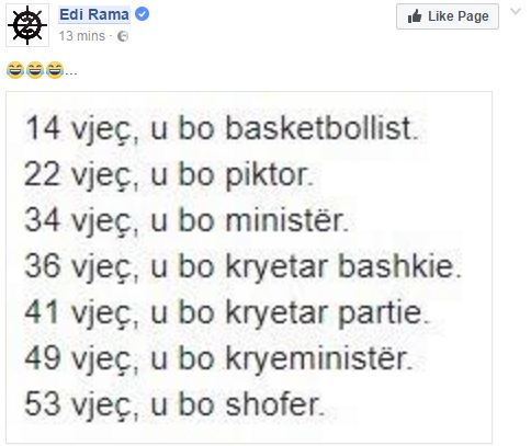 | Reagon Edi Rama, thotë se pas zgjedhjeve është bërë “shofer” Posted: 26 Jun 2017 08:45 AM PDT Kryeministri shqiptar Edi Rama ka reaguar përmes rrjetit social Facebook, për rezultatin e zgjedhjeve parlamentare në Shqipëri. Përmes një fotoje me mbishkrim të publikuar në Facebook, Rama ka shkruar se është bërë “shofer” i Shqipërisë, raporton Insajderi. “14 vjeç, u bo basketbollist”, shkruan Rama për veten. Ndërsa, pasi është bërë “piktor, ministër, kryetar bashkie, kryetar partie dhe kryeministër”, kryetari i Partisë Socialiste thotë se është bërë “shofer”. Edhe para zgjedhjeve të 25 qershorit, Rama kishte përmendur synimine tij që ta drejtonte i vetëm Shqipërinë me fitimin e mbi 71 mandateve të deputetëve. Pas numërimit të mbi 50 për qind të votave, Partia Socialiste e Edi Ramës ka arritur të fitojë 73 mandate të deputetëve. /Insajderi.com