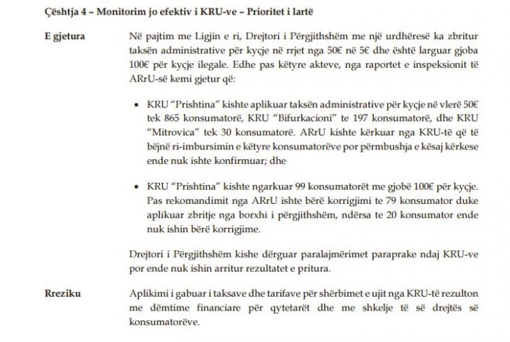 | Ujësjellësi në Ferizaj ua “vodhi” rreth 200 qytetarëve nga 45 euro Posted: 26 Jun 2017 08:29 AM PDT Kompania Rajonale e Ujësjellësit "Bifurkacioni" në Ferizaj, dëmtoi financiarisht rreth 200 konsumatorë gjatë vitit 2016. Kjo e gjetur e Auditorit Gjeneral është publikuar gjatë kësaj jave, në raportin financiar vjetor për Autoritetin Rregullativ të Ujit (ARrH). Pas raportimit të lajmit: Ujësjellësi i Prishtinës dëmtoi financiarisht afër 1000 qytetarë, Gazeta Online Insajderi sjell edhe një evidentim tjetër të Zyrës Kombëtare të Auditimit (ZKA), ku e kanë pësuar konsumatorët e ARrH-së. KRU "Bifurkacioni" dëmtoi 197 konsumatorë të saj gjatë vitit 2016, duke aplikuar ndaj tyre taksën prej 50 eurove për kyçje në rrjet të ujit, edhe pse kyçja në ujësjellës sipas një vendimi të marrë nga ARrH-ja në fillim të vitit të kaluar, ishte zbritur në 5 euro. Në këtë rast, Ujësjellësi në Ferizaj ua “vodhi” nga 45 euro 197 konsumatorëve, sipas raportit të Zyrës Kombëtare të Auditimit (ZKA). "KRU Prishtina kishte aplikuar taksën administrative për kyçje në vlerë 50€ tek 865 konsumatorë, KRU Bifurkacioni te 197 konsumatorë. ARrU kishte kërkuar nga KRU-të që të bëjnë ri-imbursimin e këtyre konsumatorëve por përmbushja e kësaj kërkese ende nuk ishte konfirmuar", thuhet në raportin e Auditorit Gjeneral. Siç njofton Zyra Kombëtare e Auditimit (ZKA), drejtori i Përgjithshëm i ARrH-së i kishte paralajmëruar kompanitë rajonale të ujësjellësve që t'ia kthejnë paratë konsumatorëve. "Drejtori i Përgjithshëm kishe dërguar paralajmërimet paraprake ndaj KRU-ve por ende nuk ishin arritur rezultatet e pritura", thuhet në raportin e ZKA-së. /Insajderi.com The post Ujësjellësi në Ferizaj ua “vodhi” rreth 200 qytetarëve nga 45 euro appeared first on INSAJDERI. |