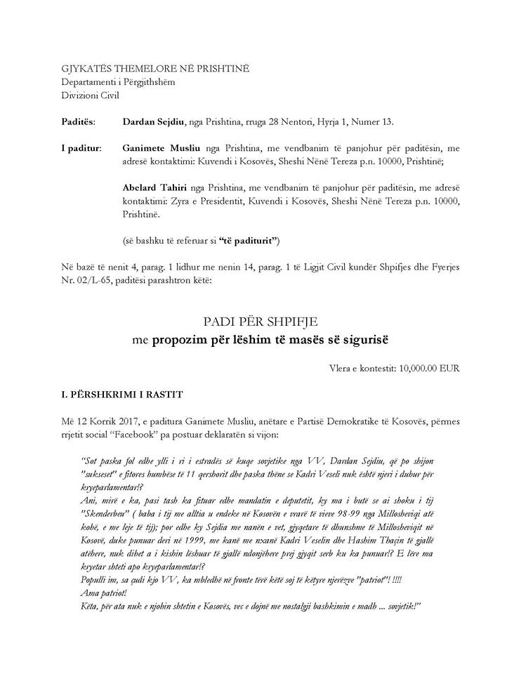 | Dardan Sejdiu padit Ganimete Musliun dhe këshilltarin e Presidentit Posted: 13 Jul 2017 09:05 AM PDT Deputeti i i Lëvizjes Vetëvendosje, Dardan Sejdiu ka dorëzuar më parë padi për shpifje, kundër deputetes nga PDK, Ganimete Musliu dhe këshilltarit të presidentit Hashim Thaçi, Abelard Tahiri. "Në vend të vajit për humbjen e 11 qershorit, kanë zgjedhur shpifjet. Për t'i ekuilibruar pazaret e shefave të tyre me pasardhësit e Millosheviqit, shpifin ndaj nesh. Kjo vetëm e vetëm që qytetarët të mendojnë se të gjithë jemi njësoj", ka shkruar Sejdiu në Facebook. "Ama, qytetarët këtyre ua dhanë përgjigjen më 11 qershor. E unë personalisht, sot. Në fotografi gjeni paditë ndaj tyre, si dhe vendimet përmes të cilave nëna ime së pari është suspenduar, e pas 2 muajsh është përjashtuar nga puna në vitin 1990 dhe asnjëherë deri pas lufte nuk ka punuar si gjyqtare", ka përfunduar ai. Sejdiu ka thënë se dëmshpërblimi nga kjo padi do të i dhurohet shoqatës së pensionistëve dhe atyre që u larguan nga puna gjatë regjimit të Millosheviqit. "Dëmshpërblimin nga kjo padi do t'ia dhuroj shoqatës së pensionistëve, shumica e të cilëve përjetuan përjashtimin nga puna gjatë regjimit të Millosheviqt në vitet e 90-ta", ka shtuar Sejdiu./Insajderi.com