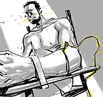| | | The former detainees said that torture sessions begin with security officers using electric shocks on a blindfolded, stripped, and handcuffed suspect while slapping and punching him or beating him with sticks and metal bars. |