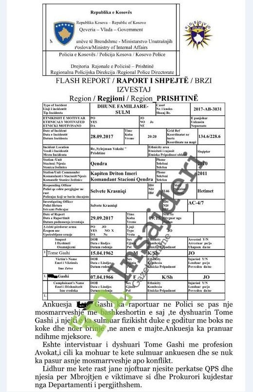 | Avokati Tomë Gashi dyshohet se grushtoi bashkëshorten e tij Posted: 01 Oct 2017 07:51 AM PDT B. Gashi pretendon se bashkëshorti i saj, Tomë Gashi, e ka sulmuar atë fizikisht të enjtën e 28 shtatorit, teksa ka raportuar në polici se bashkëshorti i saj avokat e ka goditur atë me boks në kokë . Në raportin e policisë që e ka siguruar Gazeta Online Insajderi, bëhet e ditur se B. Gashi e ka raportuar rastin në policit të premtën, një ditë pas rastit të dyshuar se ndodhi të enjtën në mbrëmje. B. Gashi i ka thënë policisë se bashkëshorti i saj e ka sulmuar atë të enjtën rreth orës 20:00. Siç ka thënë 51-vjeçarja për policinë, Tomë Gashi e ka goditur atë me boks në kokë dhe ndër brinj, raporton Insajderi. “Ankuesja B. Gashi ka raportuar në Polici se pas një mosmarrëveshje me bashkëshortin e saj, të dyshuarin Tomë Gashi, i njëjti e ka sulmuar fizikisht duke e goditur me boks në kokë dhe ndër brinjë, në anën e majtë”, thuhet në raportin e policisë për rastin në fjalë. Siç theksohet në raportin e Policisë së Kosovës, B. Gashi ka pranuar edhe ndihmë mjekësore pas incidentit. Ndërsa, avokati Gashi, i cili mbron deputetin e Lëvizjes Vetëvendosje, Frashër Krasniqi, është intervistuar nga policia, teksa ka mohuar të ketë sulmuar bashkëshortën e tij. “Është intervistuar i dyshuari Tomë Gashi me profesion avokat, i cili ka mohuar të ketë sulmuar ankuesen dhe se nuk ka pasur asnjë mosmarrëveshje apo konflikt”, thuhet në raport. Policia ka theksuar “lidhur me këtë rast janë njoftuar njësitë përkatëse QPS dhe njësia për Mbrojtjen e Viktimave, si dhe Prokurori kujdestar nga Departamenti i Përgjithshëm.” Gashi është duke mbrojtur klientin e tij, deputetin Krasniqi, për një sulm fizik të ngjashëm që ka ndodhur në po të njëjtën ditë kur bashëshortja e avokatit e ka paraqitur rastin në polici. /Insajderi.com The post Avokati Tomë Gashi dyshohet se grushtoi bashkëshorten e tij appeared first on INSAJDERI. |